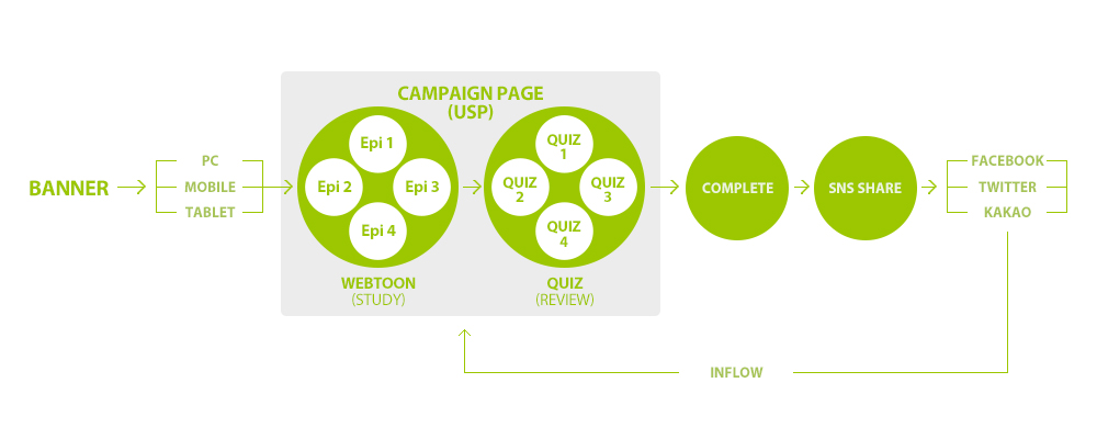 또한 제품의 4가지 특장점을 간단한 퀴즈를 통해 풀고 이벤트에 참여하는 구조로 유저는 제품의 USP를 웹툰을 보며 학습하고