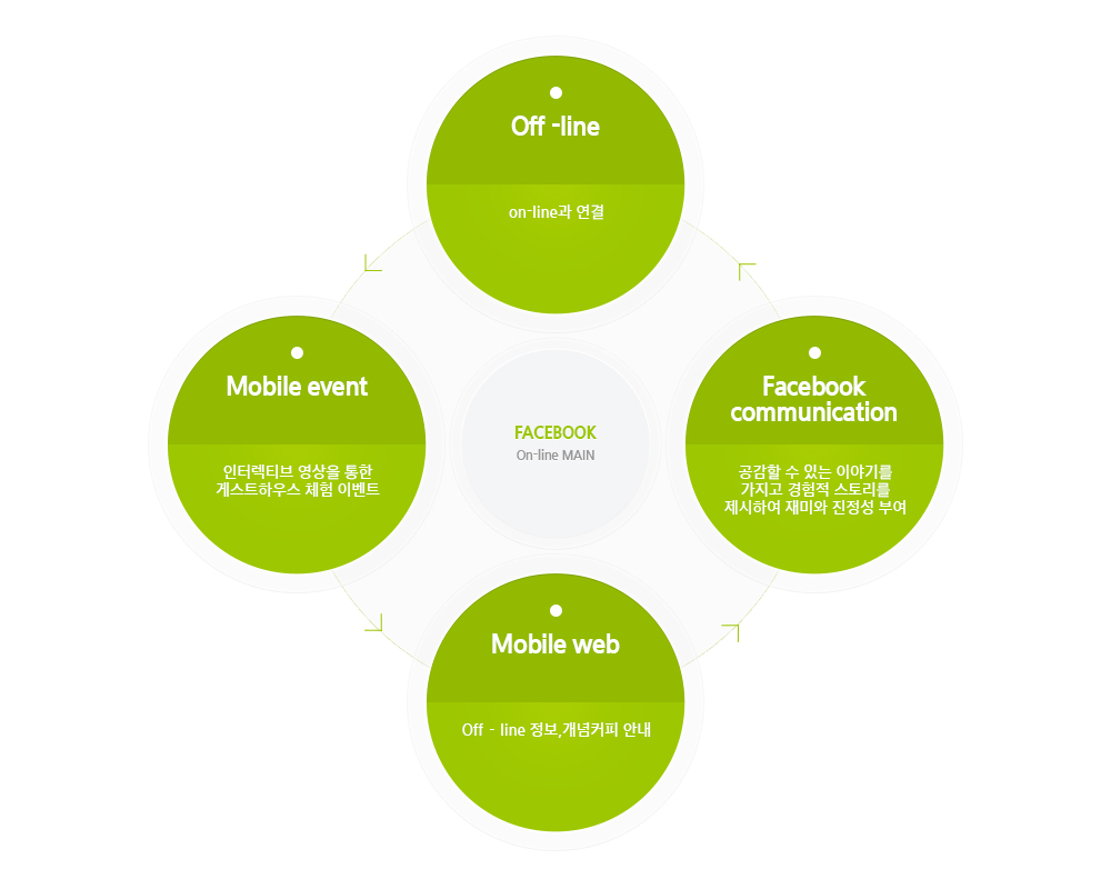 FACEBOOK을 주축으로 개념 + 이벤트 + 정보를 전달하여 사용자들과 자유로운 대화를 시도하여, 허세없는 개념커피를 알리기로 하였습니다.