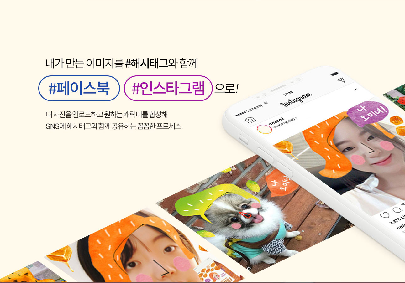 사진 앱에서 하듯 내 사진에 마음에 드는 캐릭터를 합성하고 SNS에 공유하면 베네핏을 줄 수 있도록 설계했습니다.