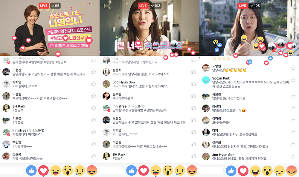 페이스북 라이브 댓글창에 실시간으로 올라오는 제품에 대한 질문을 두 출연자와 직접 출연한 이니스프리의 BM의 상세한 설명으로 효과적으로 정보를 전달할 수 있었습니다.