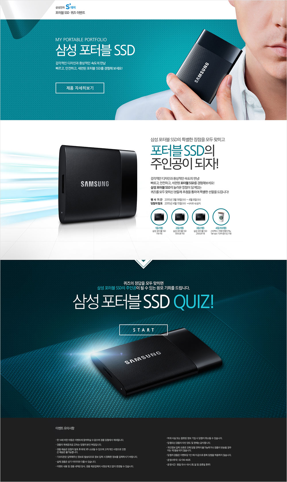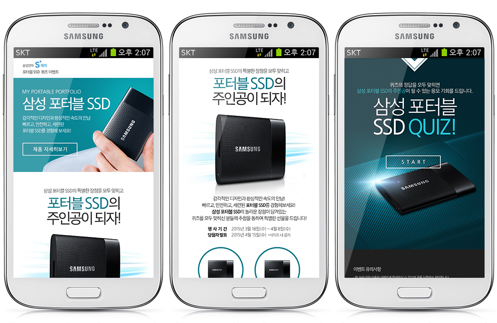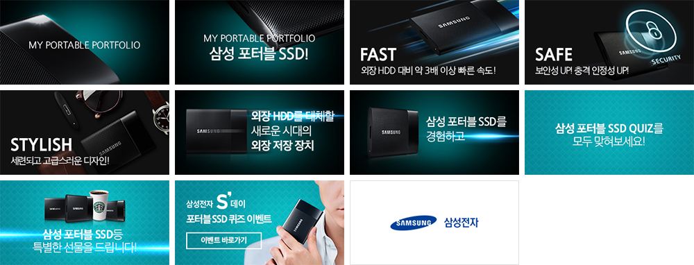 올해 초 삼성전자의 웹사이트가 반응형 웹으로 리뉴얼이 되었습니다. 이에 따라 이번 포터블 SSD 캠페인 페이지 역시 반응형 웹으로 제작하였습니다.