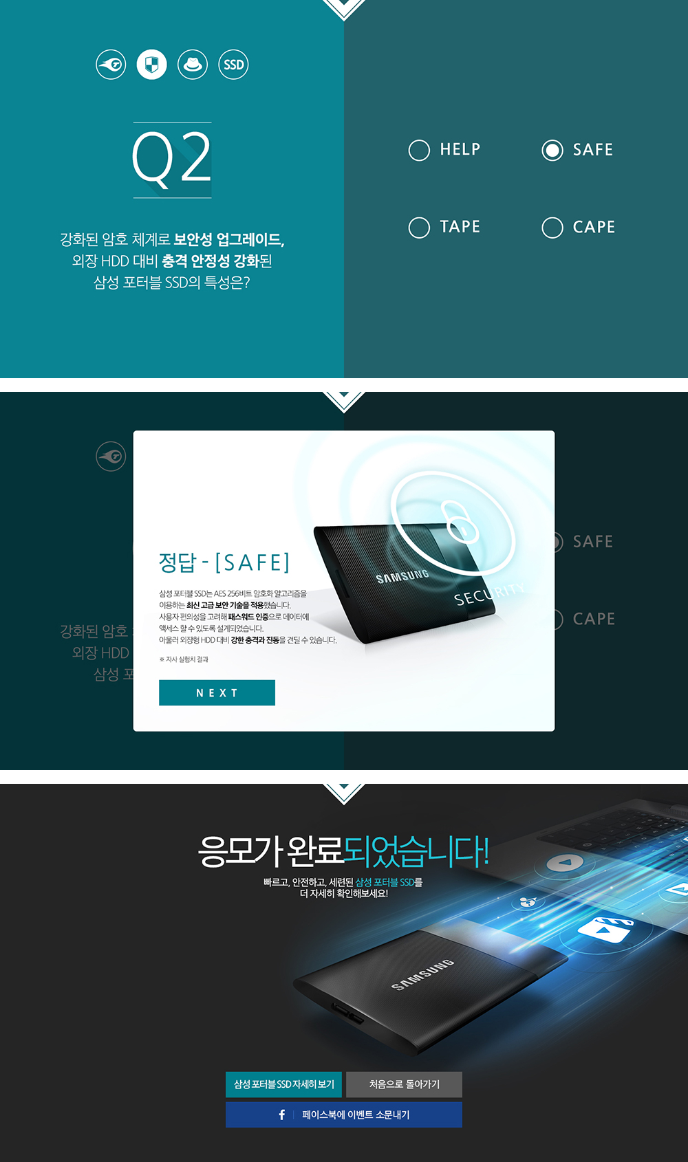 외장형 SSD는 아직 생소한 만큼 다른 외장 HDD와의 차별점을 어필하고자 했기에 쉽고 재밌는 QUIZ를 통해 제품의 USP를 전달하여