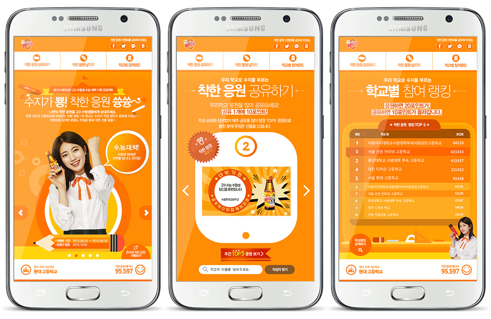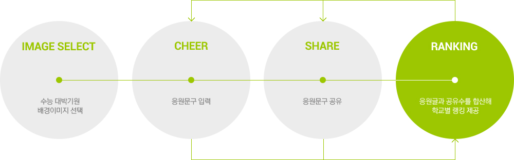 학교 별 랭킹이 책정이 되게 됨으로써, 자연스럽게 자발적인 재 참여를 유도하고 많은 이들에게 착한 응원을 보내줄 수 있는 선 순환 구조의 프로세스를 만들었습니다.